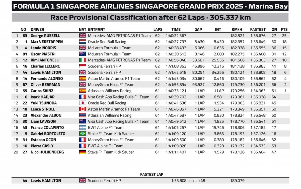 Kimi Antonelli disfrutó de una gran actuación para lograr el quinto puesto, aumentando así el récord de Mercedes, mientras que Charles Leclerc se alzó con el sexto puesto, por delante de su compañero de Ferrari, Lewis Hamilton, séptimo. Sin embargo, el siete veces campeón del mundo fue señalado por exceder los límites de la pista tras la caída de la bandera a cuadros, un incidente que se investigará después de la carrera.