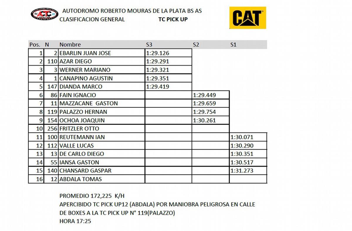 El bonaerense Juan José Ebarlín se quedó con la pole position para la 1ª Fecha del TC Pick Up que se disputa en el Autódromo ''Roberto Mouras'' -4.265 mts.- de La Plata, Pcia. de Buenos Aires. El piloto del Eze-B Team lideró los tres cortes clasificatorios con solvencia y mañana partirá adelante en la serie clasificatoria inicial del programa de domingo.