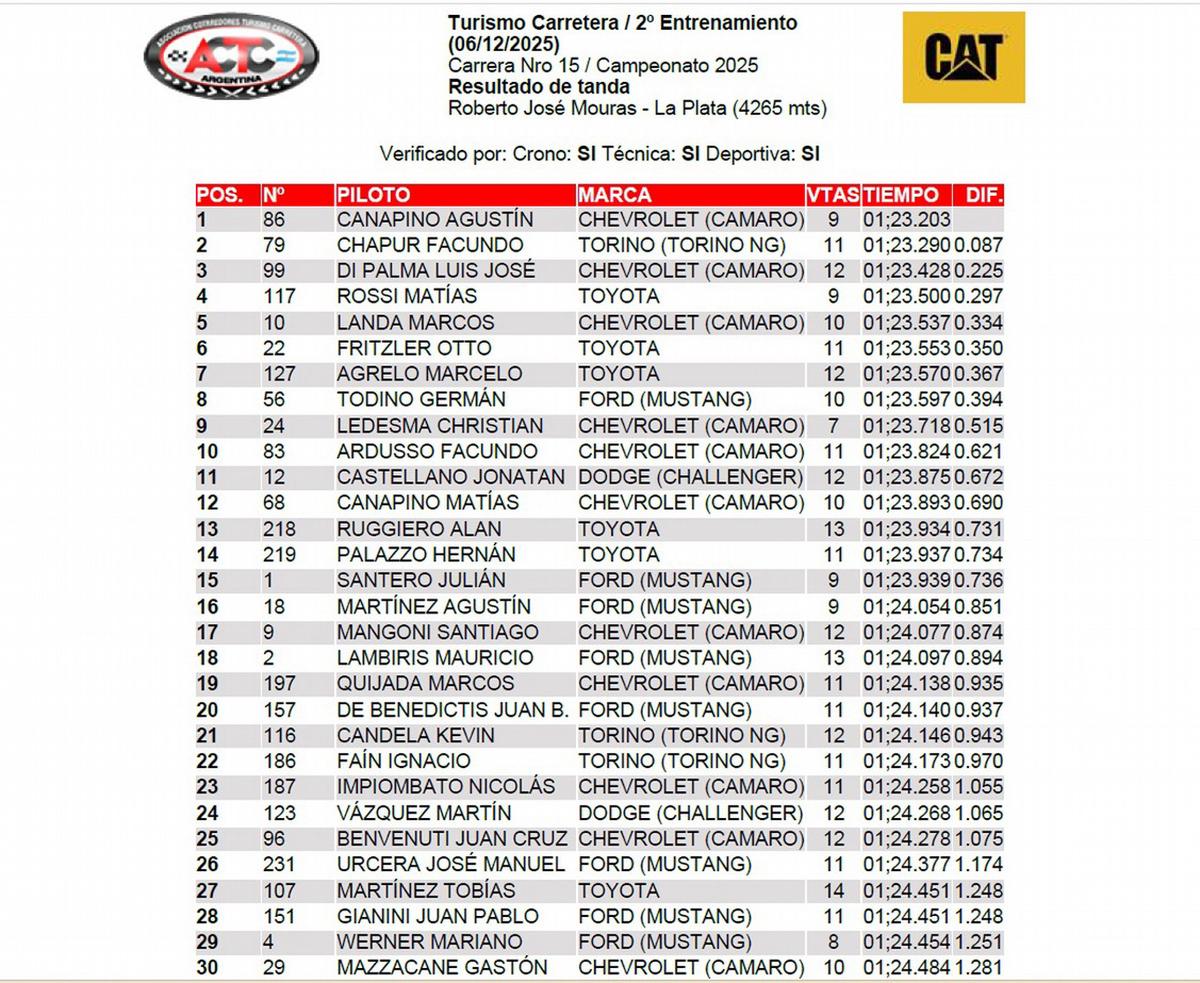 Agustín Canapino, con Chevrolet Camaro, volvió a ser el más rápido en el 2° Entrenamiento de la 15ª Fecha de Turismo Carretera, que se disputa en el Autódromo 'Roberto Mouras' -4.265mts.- de La Plata. El líder y máximo candidato de la 'Copa de Oro' 2025 se mantiene como el más veloz en los ensayos previos a la clasificación.