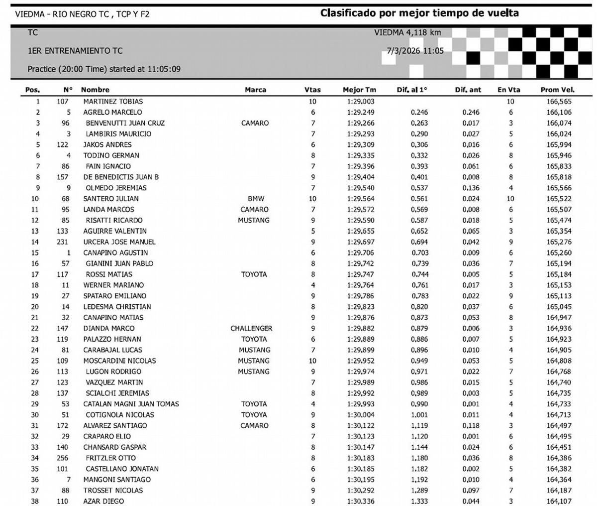 El sanjuanino Tobías Martínez, a bordo del Chevrolet Camaro #107 del equipo Rus Med se quedó con la mejor vuelta en el 1° Entrenamiento para la 2ª Fecha del Turismo Carretera que se disputa este fin de semana en el Autódromo Ciudad de Viedma -4.118 mts.-en la Pcia. de Río Negro. Sus escoltas fueron Marcelo Agrelo -Toyota Camry-, Juan C. Benevenuti -Chevrolet Camaro-, Mauricio Lambiris -Ford Mustang- y Andrés Jakos -Toyota Camry-, completando el Top 5.