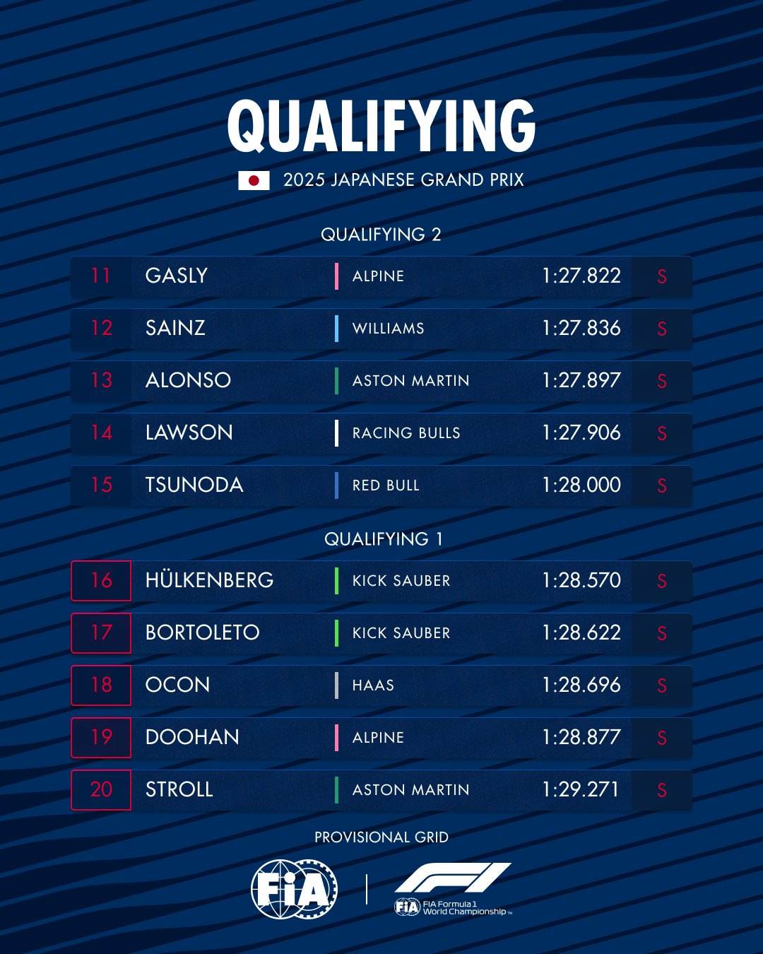 En los 4'' finales, salvo Norris, todos volvieron a salir y el orden se corrigió detrás de los cuatro primeros -Norris, Russell, Verstappen y Piastri- para que pasen con ellos al último paso clasificatorio, Leclerc, Hamilton, Antonelli, Bearman, Hadjar y Albon. Un gran trabajo de los tres ''rookies'', dejaba afuera a Gasly, Sainz, Alonso, Lawson y Tsunoda. La del japonés, tal vez, la máxima decepción, no pudiendo coronar un buen trabajo previo con la clasificación.