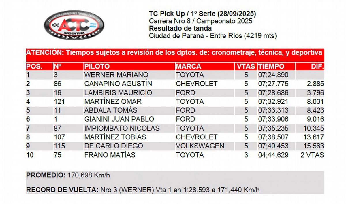 El local Mariano Werner con su Toyota Hilux ganó la serie más rápida y largará desde la 'pole' en la final del TC Pick Up que disputa su 8ª Fecha en el Autódromo Ciudad de Paraná -4.219 mts.-. Detrás suyo, quedaron Agustín Canapino de Chevrolet y Mauricio Lambiris de Ford. Germán Todino, con otra Hilux, se quedó con la otra batería -que fue 5s más lenta-, superando a Juan José Ebarlín -Toyota- e Ignacio Faín, y acompañará al paranaense en la primer fila de la final.