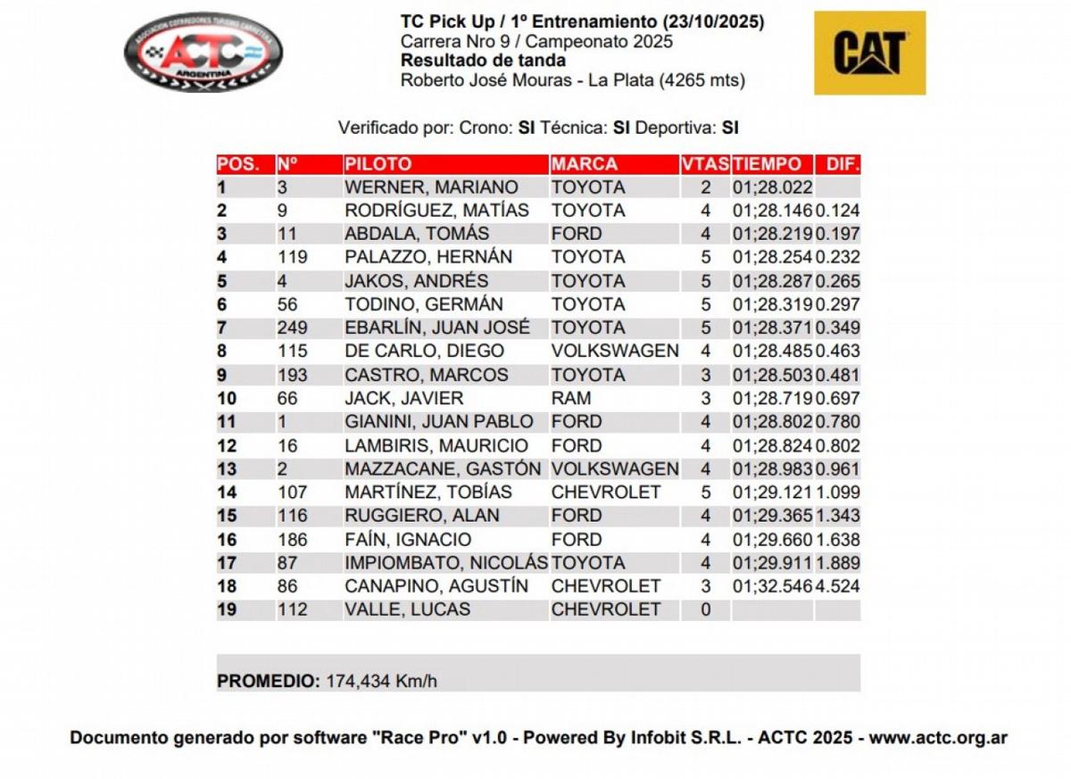 El líder de la Copa 'Shell V-Power', Mariano Werner con una Toyota Hilux se quedó con la mejor vuelta del Entrenamiento 1, en el comienza de la actividad de la Fecha 9 del TC Pick Up en el Autódromo 'Roberto Mouras' de La Plata. Con un esquema excepcional por las elecciones legislativas, la carrera se desarrolla entre el jueves 23 y el viernes 24 de octubre.