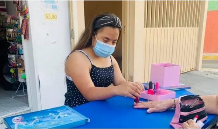 En el portal Yo También, Nurit López Castorena, su mamá, cuenta los pormenores de las imágenes que muestran a la joven sentada con un cartel que dice "Se pintan uñas gratis".