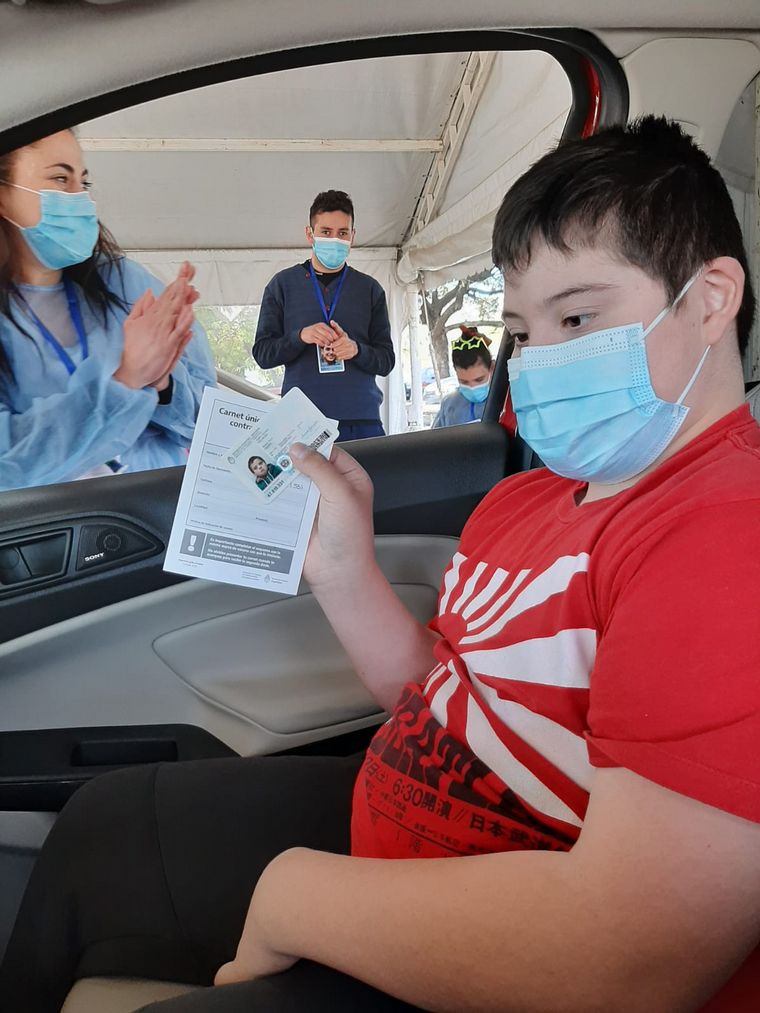 Pedro Villalba tiene 13 años y Síndrome de Down y recibió su primera dosis de Moderna en el Autovac del Hospital Clínicas.