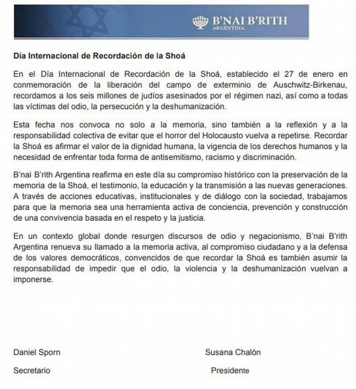La organización, una de las más antiguas y activas en defensa de los derechos humanos y la acción social judía en el país (fundada en Argentina en 1930 como parte de B''nai B''rith Internacional), recordó a las seis millones de víctimas judías asesinadas por el régimen nazi, así como a todas las personas perseguidas y deshumanizadas durante el Holocausto.