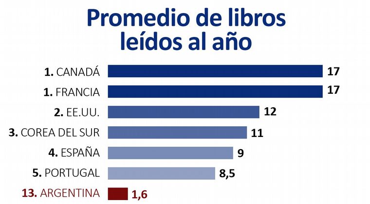 -Argentina, con 1,6 libros por habitantes al año, se ubica en lo más bajo del ranking, apenas superando a México que ostenta 1,4 libros por año por habitante.