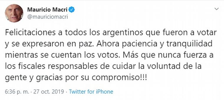 "Felicitaciones a todos los argentinos que fueron a votar y se expresaron en paz. Ahora paciencia y tranquilidad mientras se cuentan los votos", escribió el mandatario en Twitter.