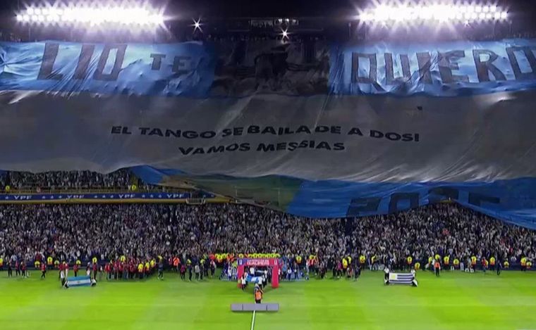"El tango se baila de a dos! Vamos Messias", decía la leyenda del imponente telón celeste y blanco que cubrió las tres bandejas, con el añadido: "Lio te quiero".