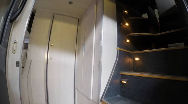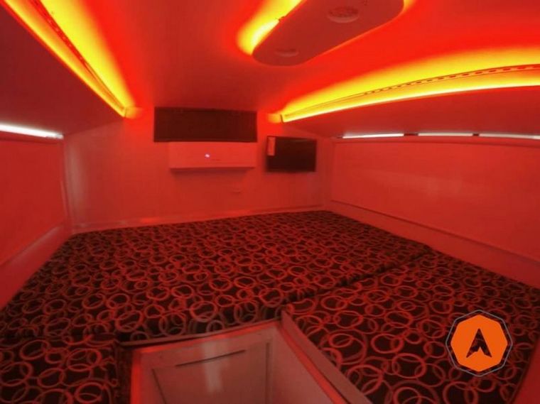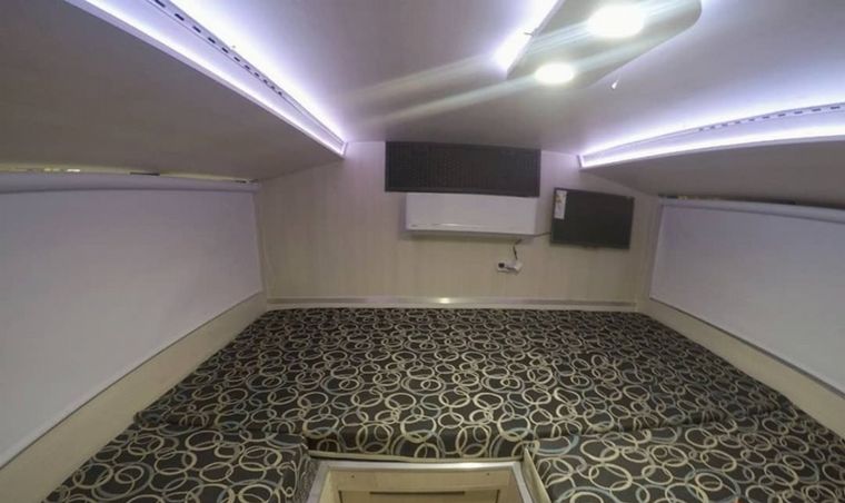 En un espacio intermedio, tiene un comedor con TV, living y una mesada de cocina. También incluye otro dormitorio con televisor en ese piso. La parte de arriba está destinada a sus músicos y equipo.