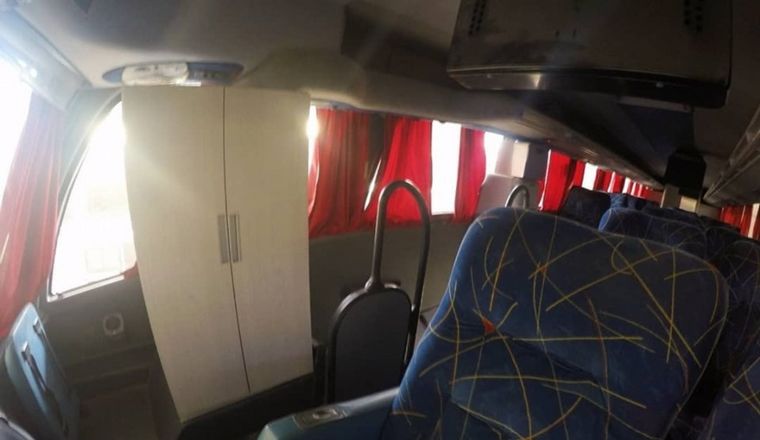 El trabajo se hizo sobre un colectivo Marcopolo G7 acondicionado por la empresa Cinzia Vehículos. En el piso de abajo tiene la suite especial para el artista, con un baño con duchador vertical y calefón.