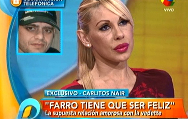 Carlitos Nair Menem le declaró su amor a la vedette Mónica Farro durante una comunicación telefónica en el programa Intrusos, y la rubia se quebró por su situación sentimental.
