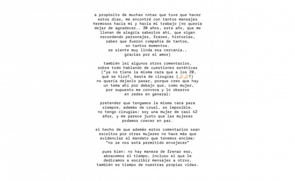 Para luego referirse a las acusaciones: "Y leí otros comentarios, sobre todo aquellos que hablaban de cuestiones estéticas (‘ya no tiene la misma cara que a los 20', ‘¿qué se hizo?’, ‘basta de cirugías’)".
