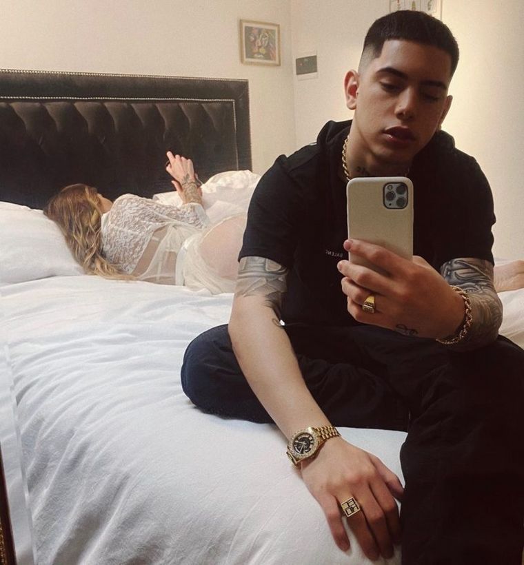 En la imagen, el joven cantante freestyle se muestra con una rubia de espaldas, tendida sobre su cama.