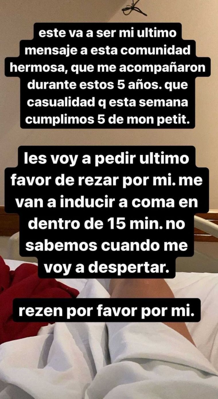 “Este va a ser mi último mensaje a esta comunidad hermosa que me acompañó durante cinco años. Les voy a pedir un último favor, recen por mí. Me van a inducir al coma dentro de 15 minutos y no sabemos cuándo voy a despertar. Por favor recen”, expresó en la publicación.