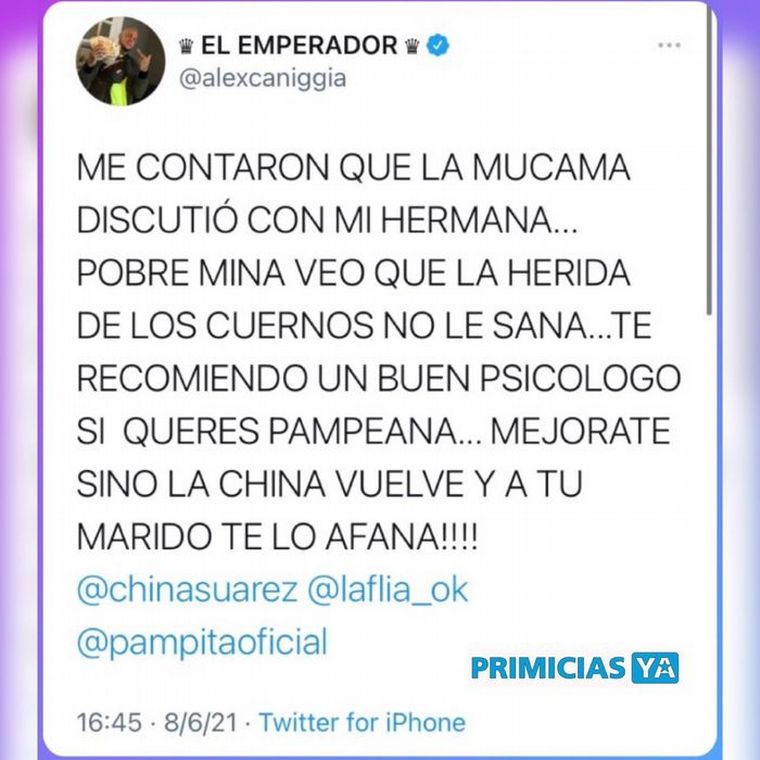"Me contaron que la mucama discutió con mi hermana. Pobre mina, veo que la herida de los cuernos no le sana. Te recomiendo un buen psicólogo si querés pampeana. Mejorate sino La China vuelve y a tu marido te lo afana", escribió Alex en Twitter.