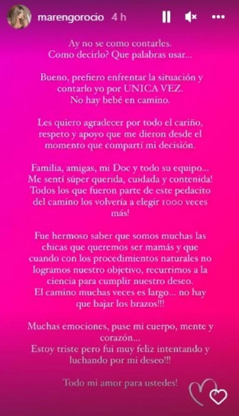 Además, aclaró que sus intentos por ser madre no se terminaron: "Muchas emociones, puse mi cuerpo, mente y corazón. Estoy triste, pero fui muy feliz intentando y luchando por mi deseo. Todo mi amor para ustedes".