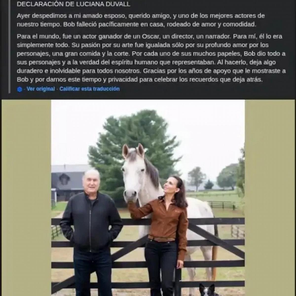 El mundo del espectáculo está de duelo tras conocerse el fallecimiento del aclamado actor estadounidense Robert Duvall a sus 95 años. La argentina Luciana Pedraza, esposa del artista, fue quien confirmó la triste noticia a través de un comunicado difundido en The Daily Mail.