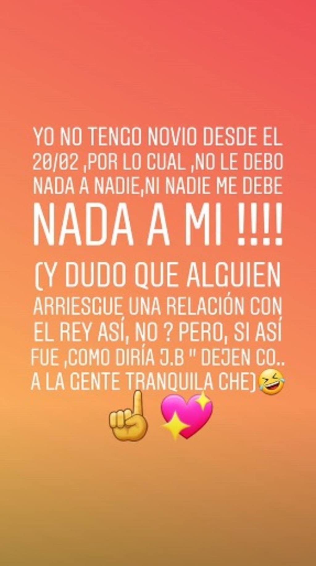 En su mensaje en redes sociales, Nicole también se refirió a sus rumores sobre su ex: "Dudo que alguien arriesgue así una relación con el rey, ¿no? Pero si así fue, como diría J.B., 'dejen co... a la gente tranquila, che'".