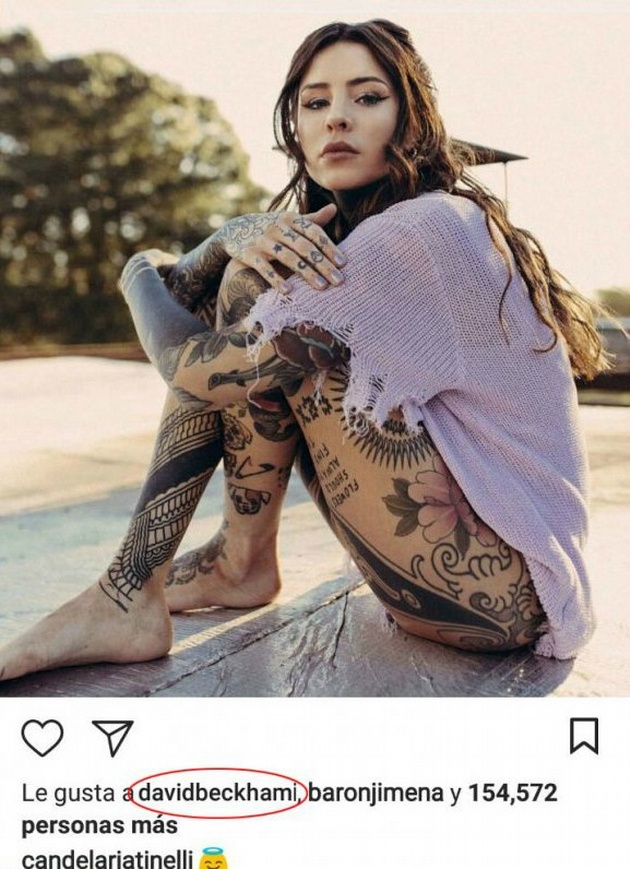 Pese a que Beckham no está entre los casi 40 mil seguidores que tiene Cande, le dio me gusta a su fotografía donde además de desplegar su belleza mostró algunos de los tantos tatuajes que decoran su figura.