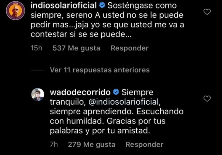 Por su parte, De Pedro agradeció las palabras del cantante: “Siempre tranquilo, Indio Solari, siempre aprendiendo. Escuchando con humildad. Gracias por tus palabras y por tu amistad”, respondió.
