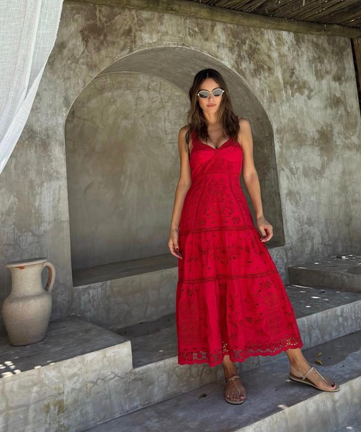 En las fotos publicadas en Instagram, Pampita aparece luciendo un solero largo de color rojo intenso, con bordados florales calados y una caída liviana que acompaña el movimiento del cuerpo.
