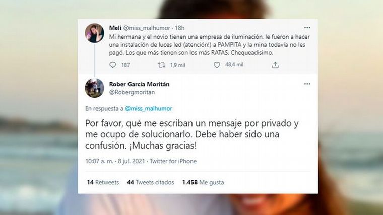 Roberto García Moritán se encargó de solucionar un aparente malentendido que una usuaria hizo público en Twitter. La joven aseguraba que su esposa no había pagado la compra de luminarias para su casa.