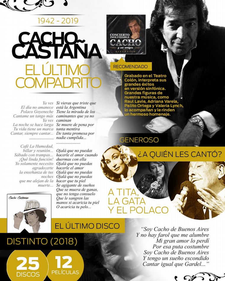 Además de ser autor de grandes éxitos como “Café La Humedad”, “Lo llaman el matador”, “La reina de la bailanta”, “Señora si usted supiera”, “Garganta con arena”, Cacho Castaña tuvo participación en numerosas películas como actor y compositor.