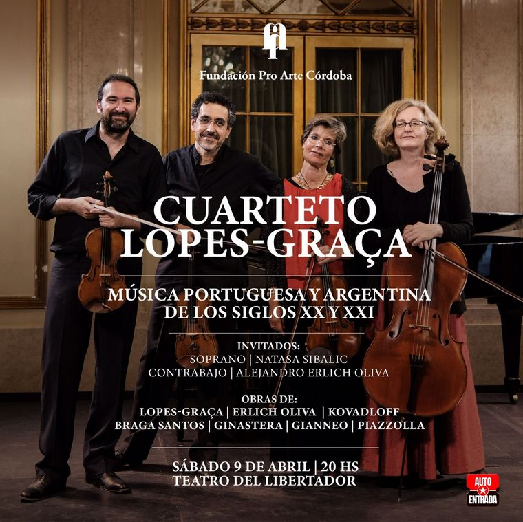 La Fundación Pro Arte Córdoba comienza su Temporada 2022 presentando, desde Portugal, al prestigioso Cuarteto Lopes-Graça acompañados en esta gira internacional por Alejandro Erlich-Oliva en contrabajo y la soprano serbia Natasa Sibalic, interpretando un programa con músicas de compositores portugueses, brasileros y argentinos.
