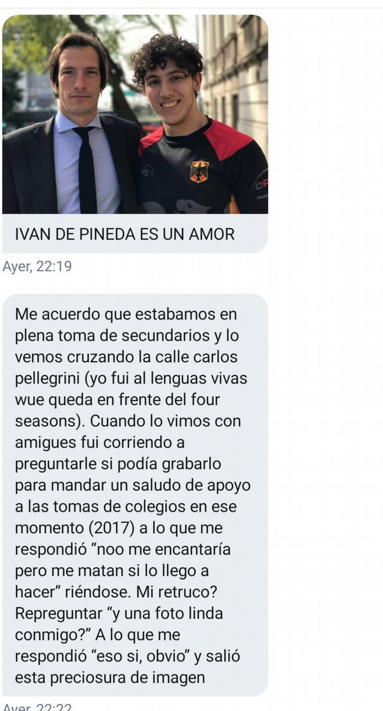 Identificado con el nombre Diego, el usuario @yyeguo contó que se cruzó a Iván de Pineda en la calle cuando realizaba junto a sus compañeros una "toma de colegio" en pedido de un reclamo en el 2017.