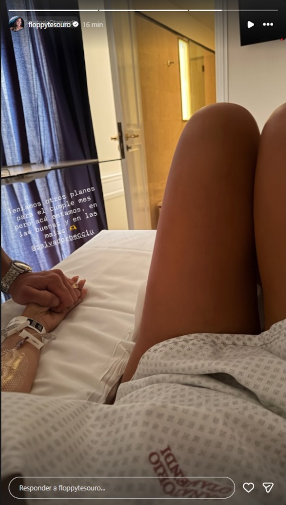 El apoyo también llegó de parte de su pareja, Salvador Becciu, a quien la modelo agradeció públicamente en otra fotografía tomada en la habitación del sanatorio. En la imagen se los ve tomados de la mano mientras Tesouro permanece sentada en la cama, aún con el brazo canalizado. “Teníamos otros planes para el cumple mes, pero acá estamos, en las buenas y en las malas”, escribió la modelo.