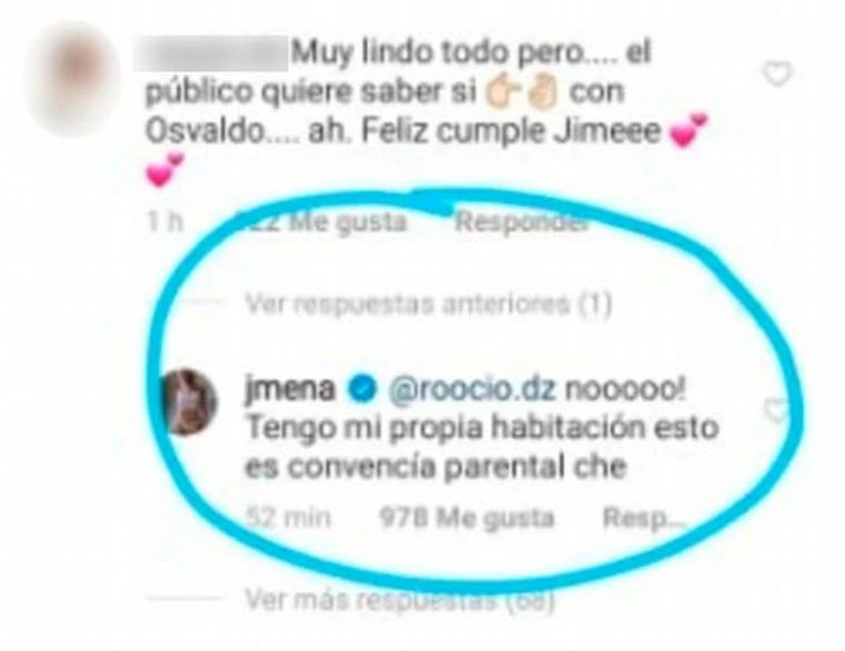 Luego de una profunda reflexión con fotos y videos de la celebración en su día, una seguidora le preguntó si tenía relaciones sexuales con el padre de su hijo. A lo que la actriz respondió: "¡Noooo! Tengo mi propia habitación. ¡Esto es convivencia parental, che!".