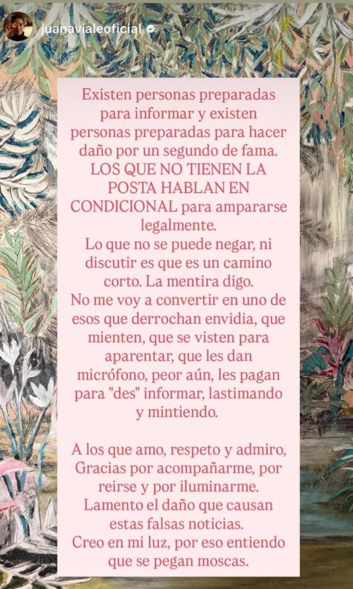 Viale agradeció el acompañamiento de su entorno más cercano y lamentó el daño que, según señaló, generan este tipo de versiones. "A los que amo, respeto y admiro, gracias por acompañarme. Lamento el daño que causan estas noticias falsas", escribió, y concluyó: "Creo en mi luz, por eso entiendo que se pegan moscas".