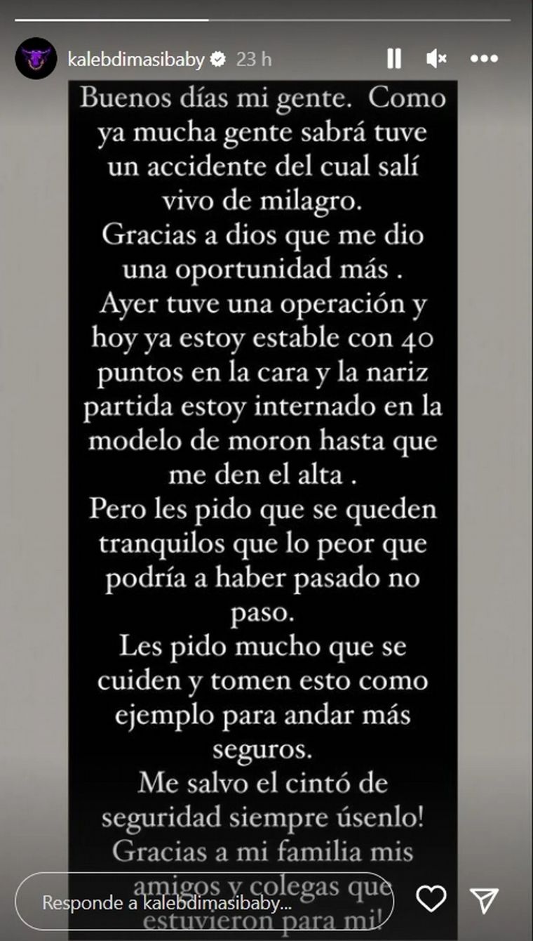 "Buenos días mi gente. Como ya mucha gente sabrá tuve un accidente del cual salí vivo de milagro. Gracias a Dios que me dio una oportunidad más”, confirmó el cantante desde su cuenta oficial de Instagram, tras la viralización de un video posterior al accidente vial.