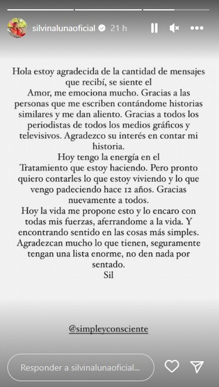 "Hola, estoy agradecida de la cantidad de mensajes que recibí, se siente el amor, me emociona mucho. Gracias a las personas que me escriben contándome historias similares y me dan aliento. Gracias a todos los periodistas de todos los medio gráficos y televisivos. Agradezco su interés en contar mi historia. Hoy tengo la energía en el tratamiento que estoy haciendo", escribió la modelo.