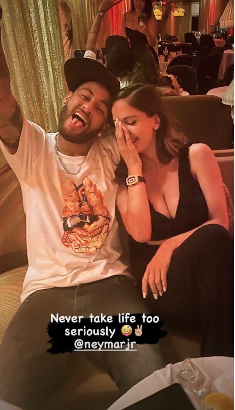 La imagen, compartida por la modelo en sus historias de Instagram, los muestra abrazados y sonrientes en un lujoso restaurante con la frase “Nunca te tomes la vida muy en serio”.