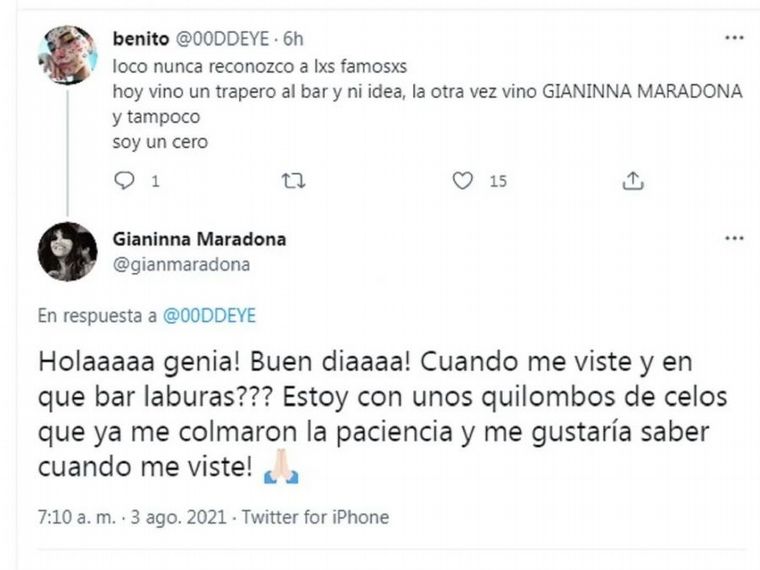 El amor entre Gianinna Maradona y Daniel Osvaldo parece haber llegado a su fin. Los primeros indicios los dio la hija de Diego, cuando el martes, luego de que una usuaria de Twitter asegurara haberla visto en un bar, le consultó: "¡Hola, genia! Buen día. ¿Cuándo me viste y en qué bar laburás? ¡Estoy con unos quilombos de celos que ya me colmaron la paciencia y me gustaría saber cuándo me viste!".
