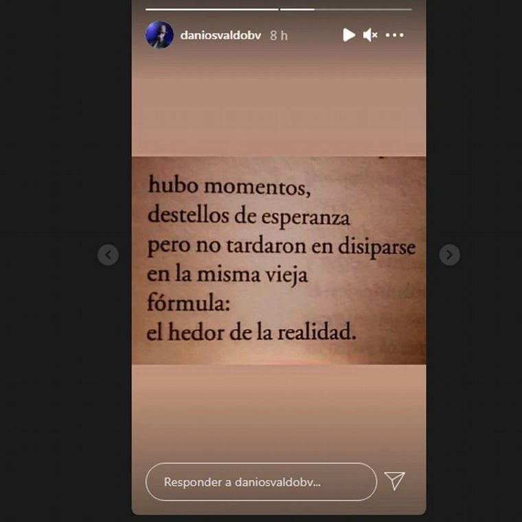 Si bien ninguno de los dos dejó en evidencia que la pareja estaba en crisis, Daniel Osvaldo se expresó a través de sus redes sociales con una contundente frase: "Hubo momentos, destellos de esperanza, pero no tardaron en disiparse en la misma vieja fórmula: el hedor de la realidad", publicó.