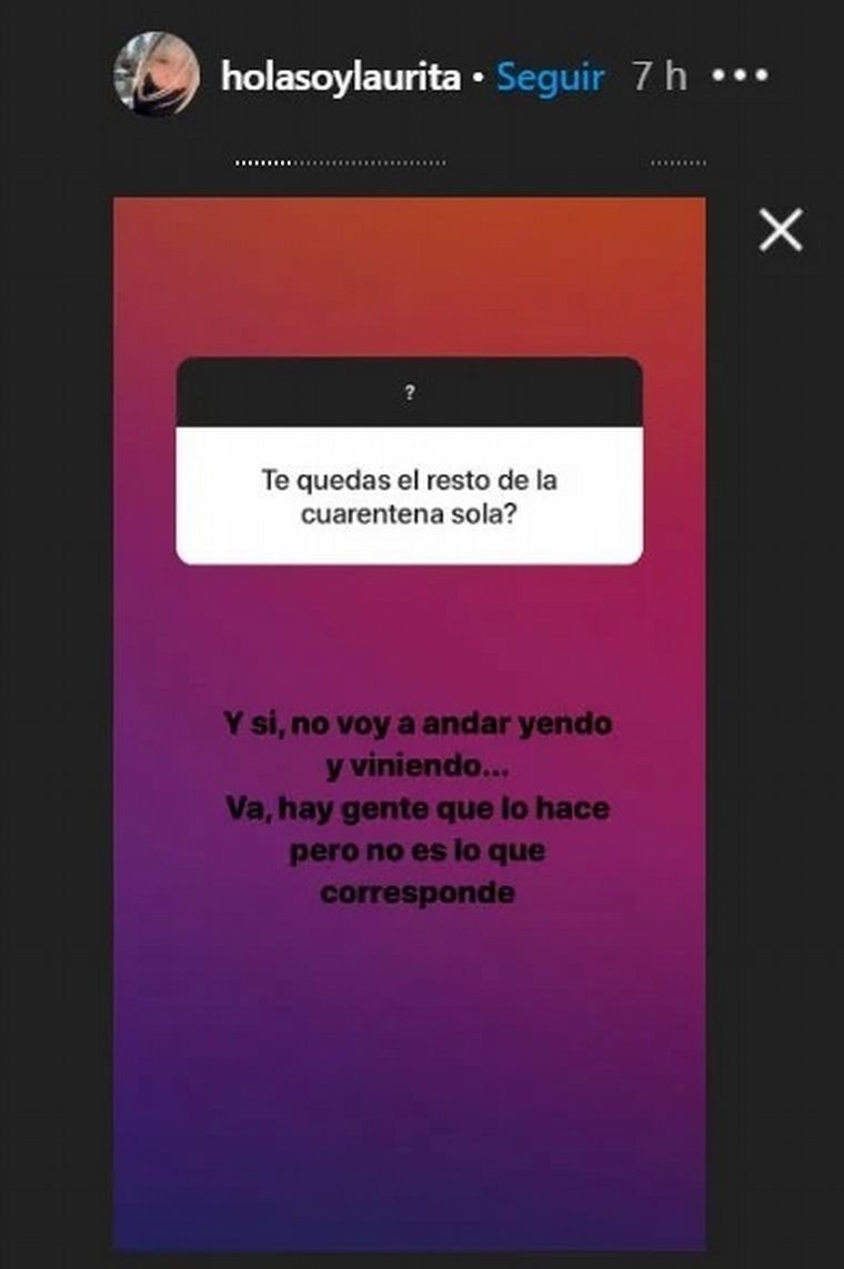 Luego, otro usuario le consultó: "¿Te quedás el resto de la cuarentena sola?". A lo que Laurita contestó: "Y sí, no voy a andar yendo y viniendo. Bah, hay gente que lo hace, pero no es lo que corresponde".