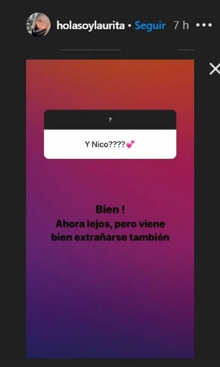 "¿Y Nico?", le preguntó un seguidor en Instagram, a lo que respondió: "¡Bien! Ahora, lejos. Pero viene bien extrañarse también".