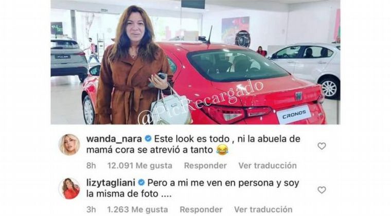 "Este look es todo, ni la abuela de Mamá Cora se atrevió a tanto", comentó en tono jocoso, en referencia al icónico personaje de Antonio Gasalla. "Pero a mí me ven en persona y soy la misma de la foto", retrucó Lizy.