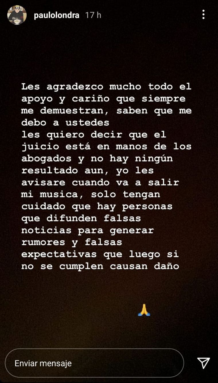 En su cuenta de Instagram, Londra publicó un posteo en el que señaló que "el juicio está en manos de los abogados y no hay aún ningún resultado" y agregó: "Yo les avisaré cuándo va a salir mi música".