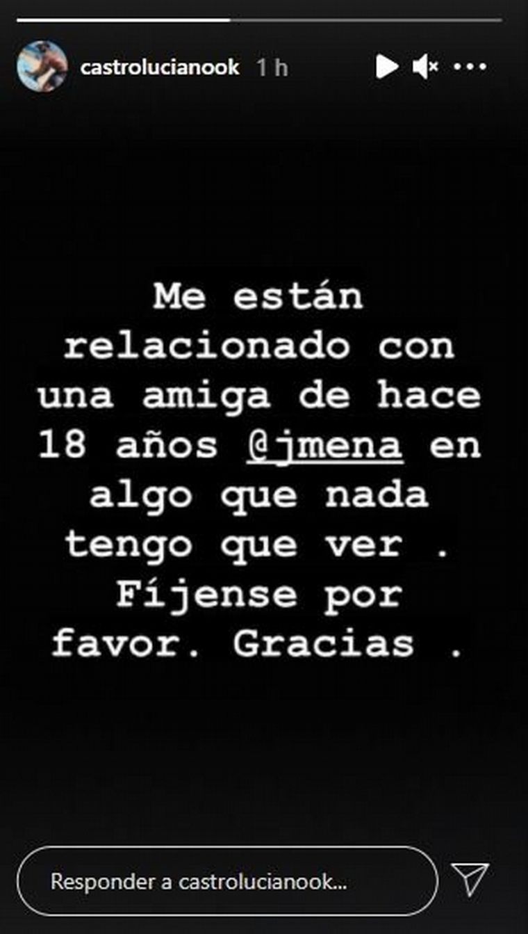 "Me están relacionando con una amiga de hace 18 años @jmena, en algo que nada tengo que ver. Fíjense por favor. Gracias", manifestó Castro en una historia de Instagram, negando un romance con Jimena Barón, con quien este año protagonizará una película de alto voltaje erótico.