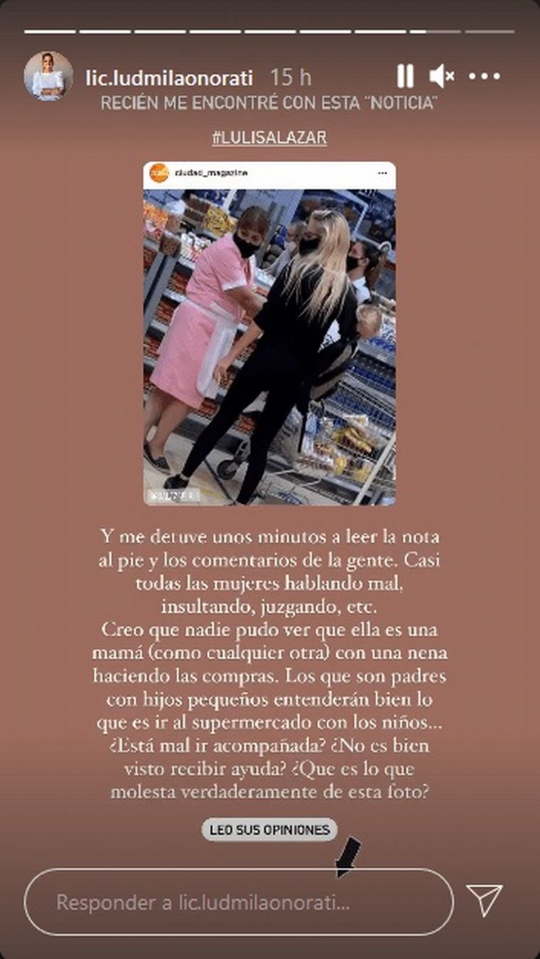 Los comentarios llegaron a la propia Salazar que argumentó: “Me detuve unos minutos a leer la nota al pie y los comentarios de la gente. Casi todas las mujeres hablando mal, insultando, juzgando, etc. Creo que nadie pudo ver que ella es una mamá (como cualquier otra) con una nena haciendo las compras. Los que son padres con hijos pequeños entenderán bien que es ir al supermercado con los niños”.