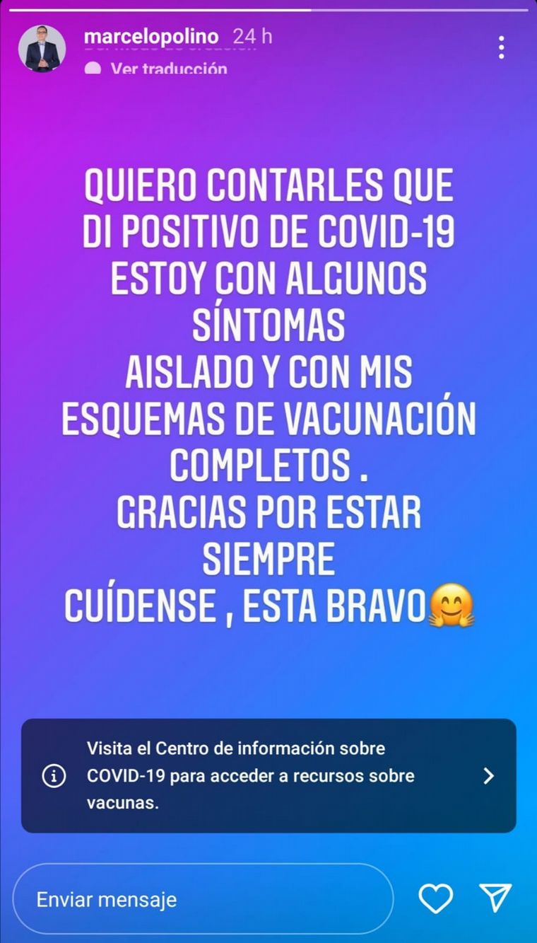 Marcelo Polino confirmó que se encuentra aislado tras haber dado positivo al test de coronavirus.