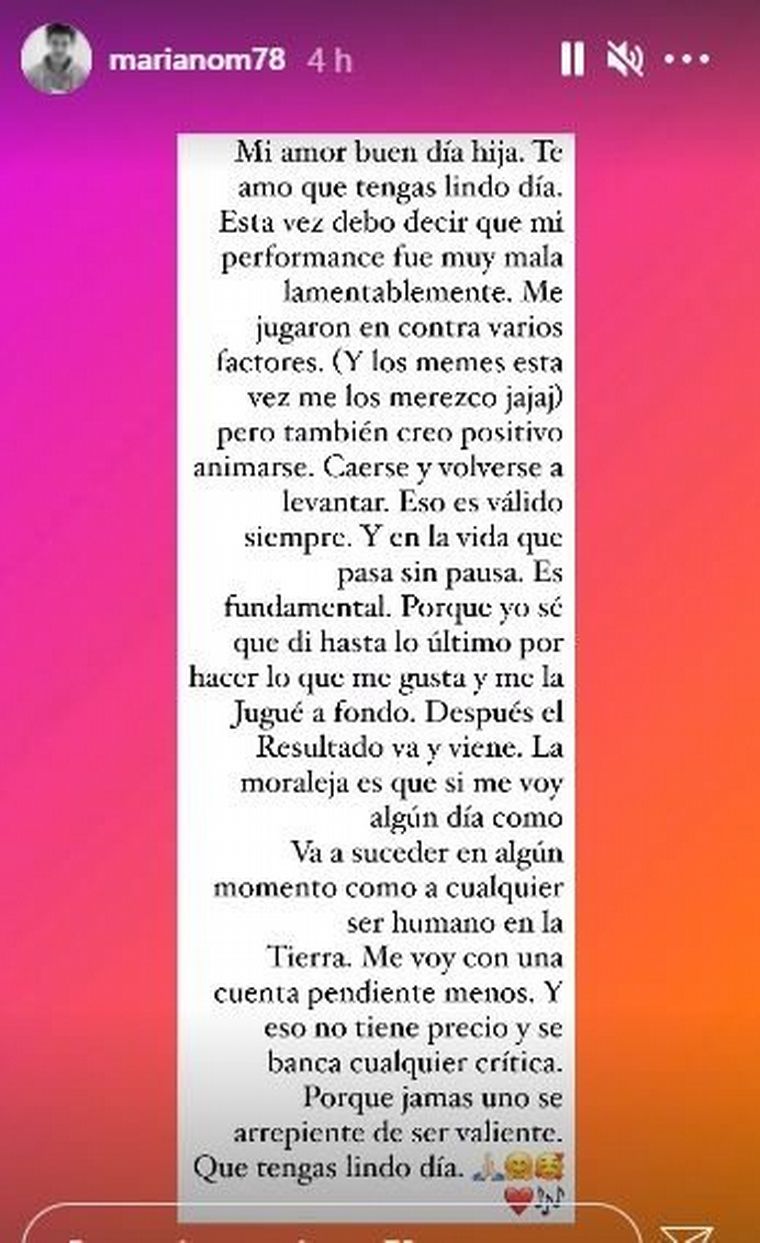 A través de sus stories de Instagram, Mariano publicó un significativo mensaje que le mandó a su hija, Olivia, reflexionando sobre esta nueva etapa profesional.