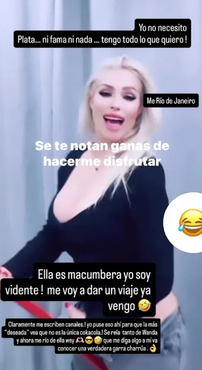 Ante la repercusión de sus palabras, escribió una historias ironizando sobre la situación que estaría viviendo la China Suárez, similar a la que vivió Wanda en su momento. “Si fue así con ella…. Tambien lo será contigo”, expresó la vedette en sus redes sociales.