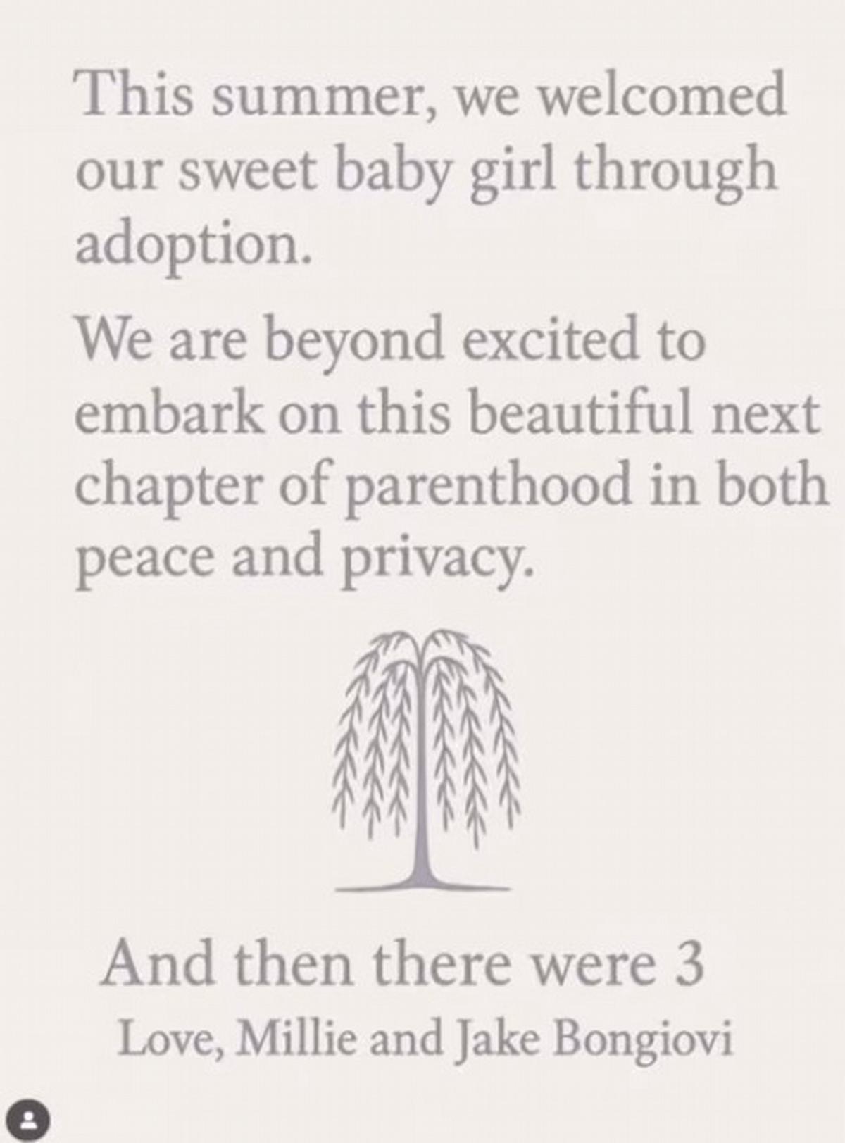 La pareja, que contrajo matrimonio en 2024, compartió la noticia con sus seguidores en redes sociales. “Este verano le dimos la bienvenida a nuestra dulce niña a través de la adopción. Estamos más que emocionados de embarcarnos en este hermoso próximo capítulo de la paternidad en paz y privacidad. Y entonces somos tres. Con amor, Millie y Jake Bongiovi”, escribieron en un comunicado.