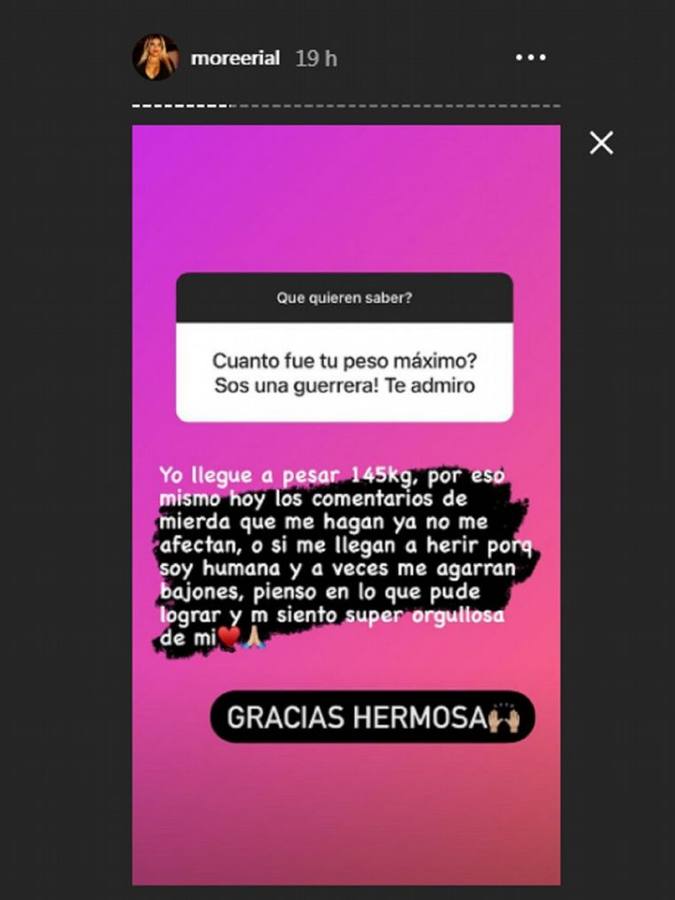 "¿Cuánto fue tu peso máximo? Sos una guerrera. ¡Te admiro!", le preguntó un usuario. "Yo llegué a pesar 145 kilos", reveló la hija de Jorge Rial.