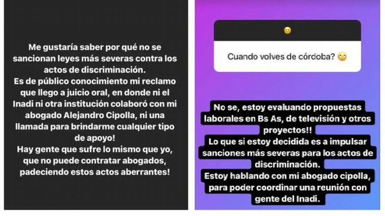 En otra publicación en sus historias, la joven reveló que va a pedir un encuentro con Victoria Donda. "Estoy decidida a impulsar naciones más severas para los actos de discriminación. Estoy hablando con mi abogado para poder coordinar una reunión con la gente del INADI", agregó.